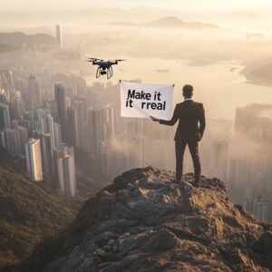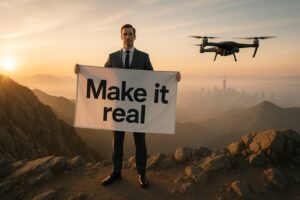 „Elegantně oblečený muž v na míru šitém obleku stojí sebevědomě na skalnatém vrcholu hory při východu slunce a drží velký bílý transparent s výrazným černým nápisem „Make it real“. Kolem něj se ve vzduchu vznáší elegantní dron, který vrhá jemný stín na zem. V dálce se v lehké ranní mlze rýsuje rozlehlá městská krajina, kterou prosvětlují jemné paprsky slunce. Scéna je nasvícena dramatickým osvětlením, které zdůrazňuje kontrast mezi drsnou horou a hladkou městskou siluetou, s realistickými stíny a přirozenými barvami.“