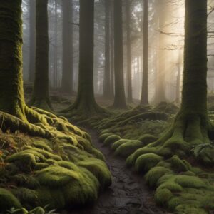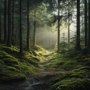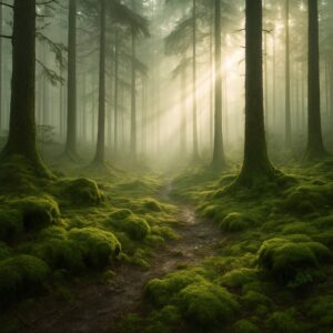 „A misty morning in the forest, light filtering through the trees, damp soil, detailed moss.“