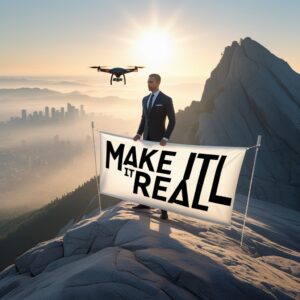 „A sharply dressed man in a tailored suit stands confidently on a rocky mountain peak at sunrise, holding a large white banner with bold black text reading „Make it real“. Around him, a sleek drone hovers gently in mid-air, casting a subtle shadow on the ground. In the distant background, a sprawling cityscape emerges through a light morning mist, with soft rays of sunlight breaking through the fog. The scene features dramatic lighting emphasizing contrast between the rugged mountain and the smooth urban skyline, with realistic shadows and natural colors.“