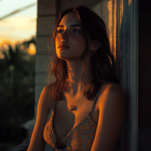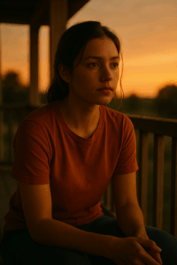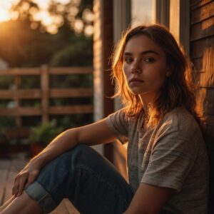 „A young woman sitting on a porch at sunset, close-up shot, realistic lighting, cinematic atmosphere.“